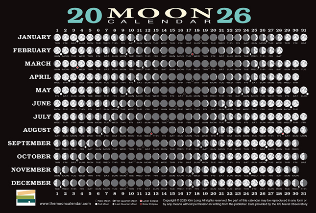 Meanwhile, the author produced The Moon Book, a companion to the calendar with background information, perspective, and much more information about the cycles of moon phases. As of 2025, this title has gone through several printings and is now updated in its third edition. The Moon Almanac is another extension of the theme, with annual editions that feature accurate times and dates of key moon cycles for 15 major